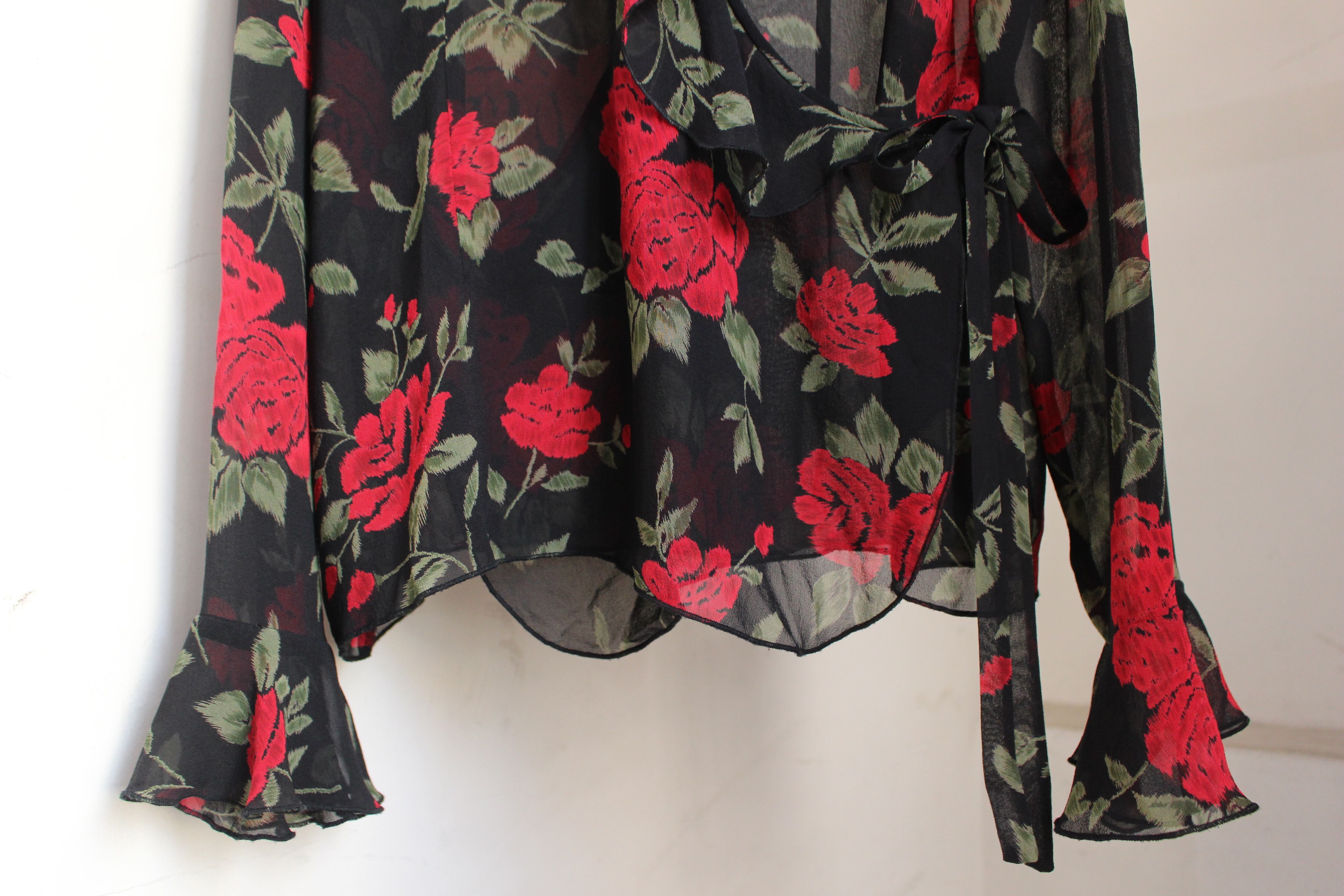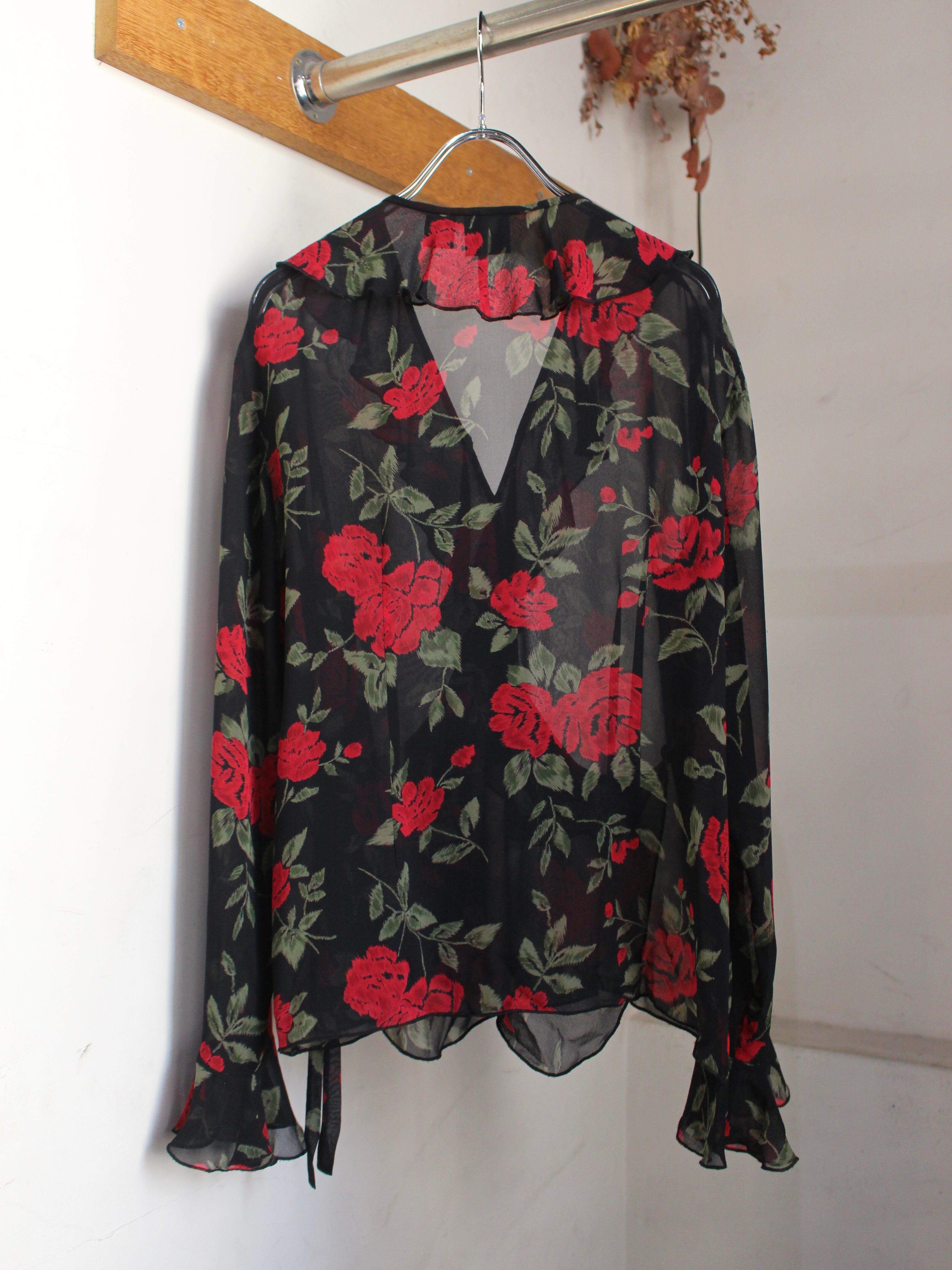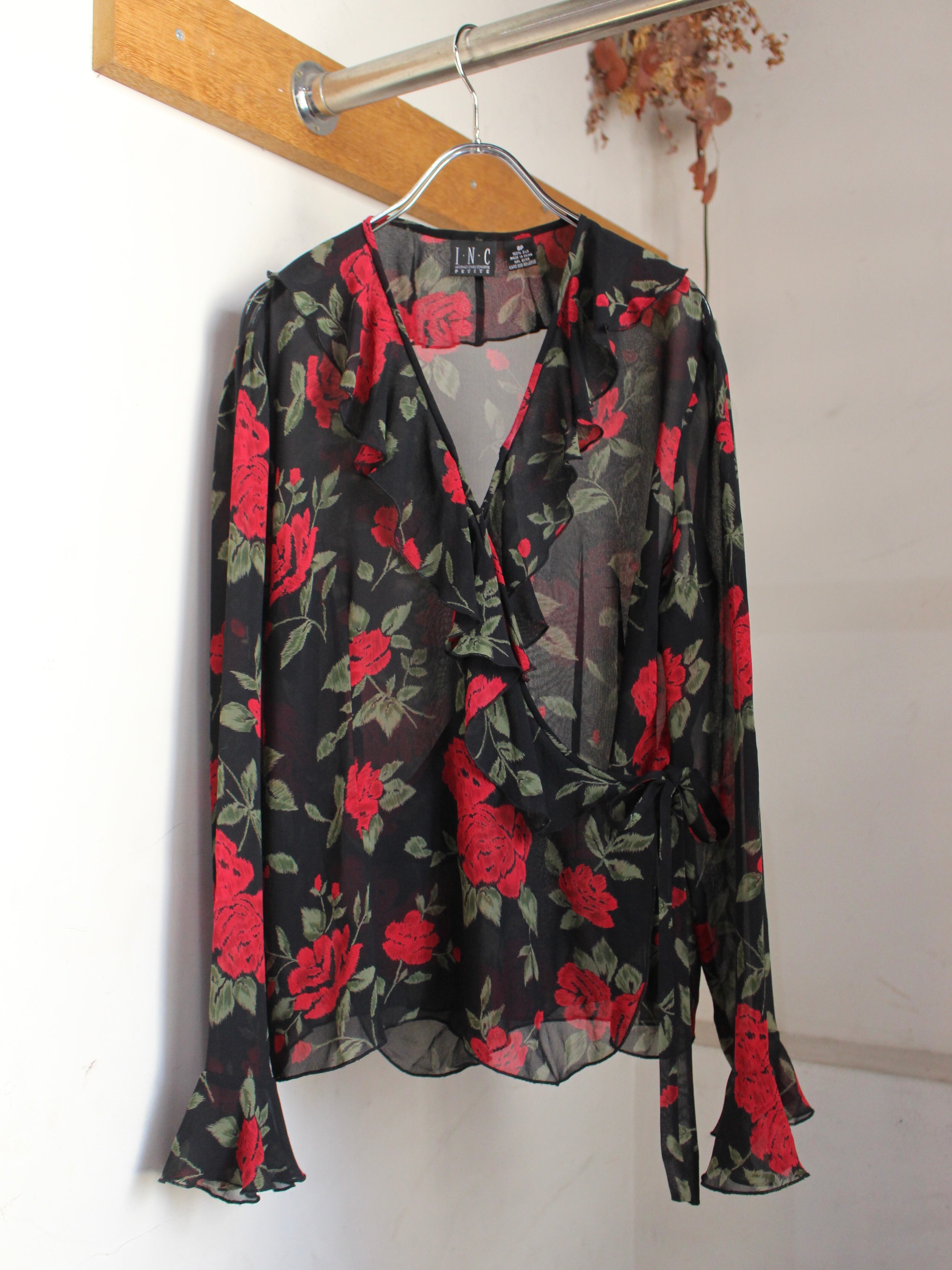 Rose print silk cache-coeur blouse / 古着 ヴィンテージ シルクブラウス 長袖 バラ柄