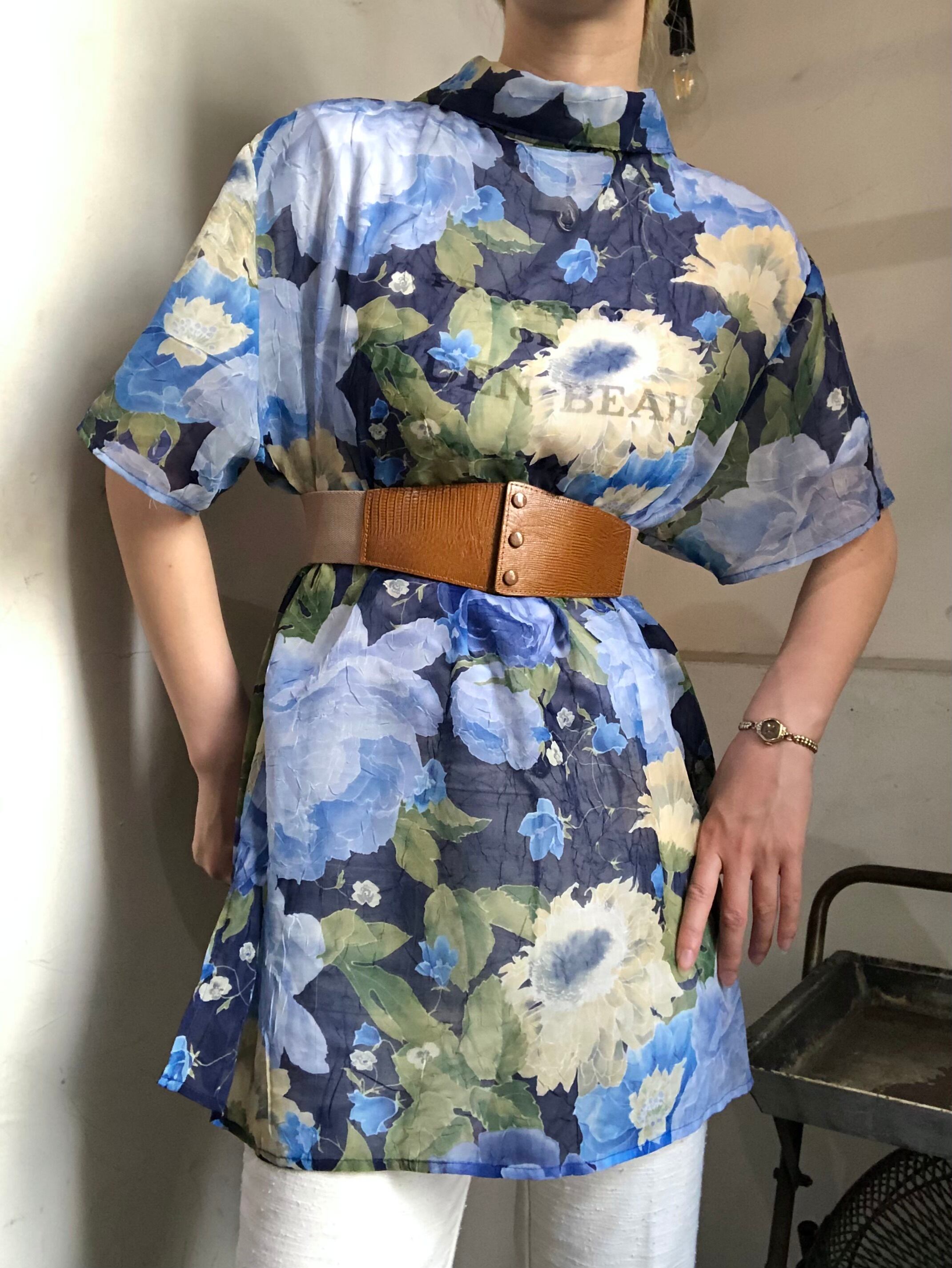 Blue flower sheer short sleeve shirts made in U.S.A / 古着 ヴィンテージ 半袖シャツ シアーシャツ 花柄 青 緑