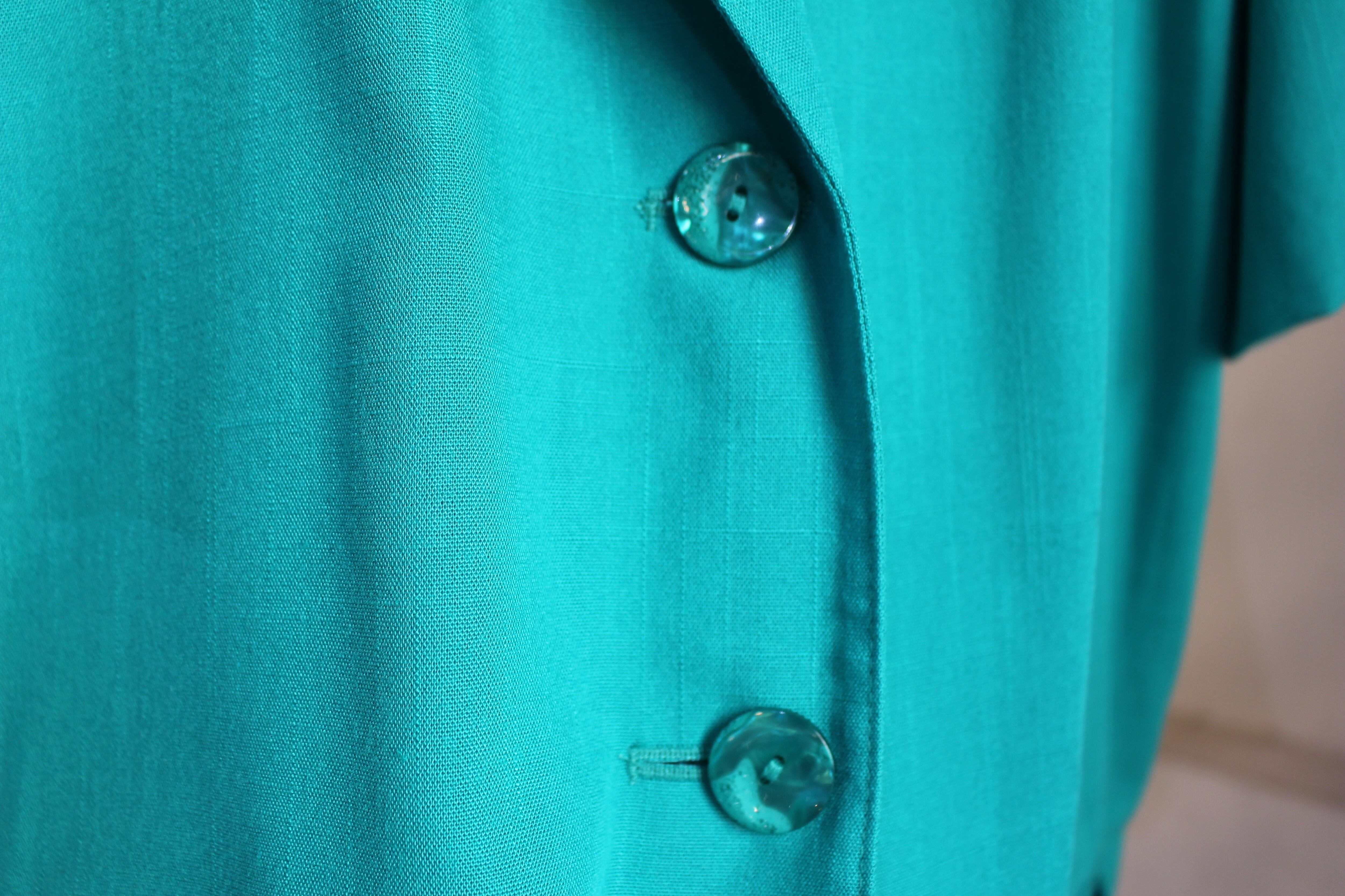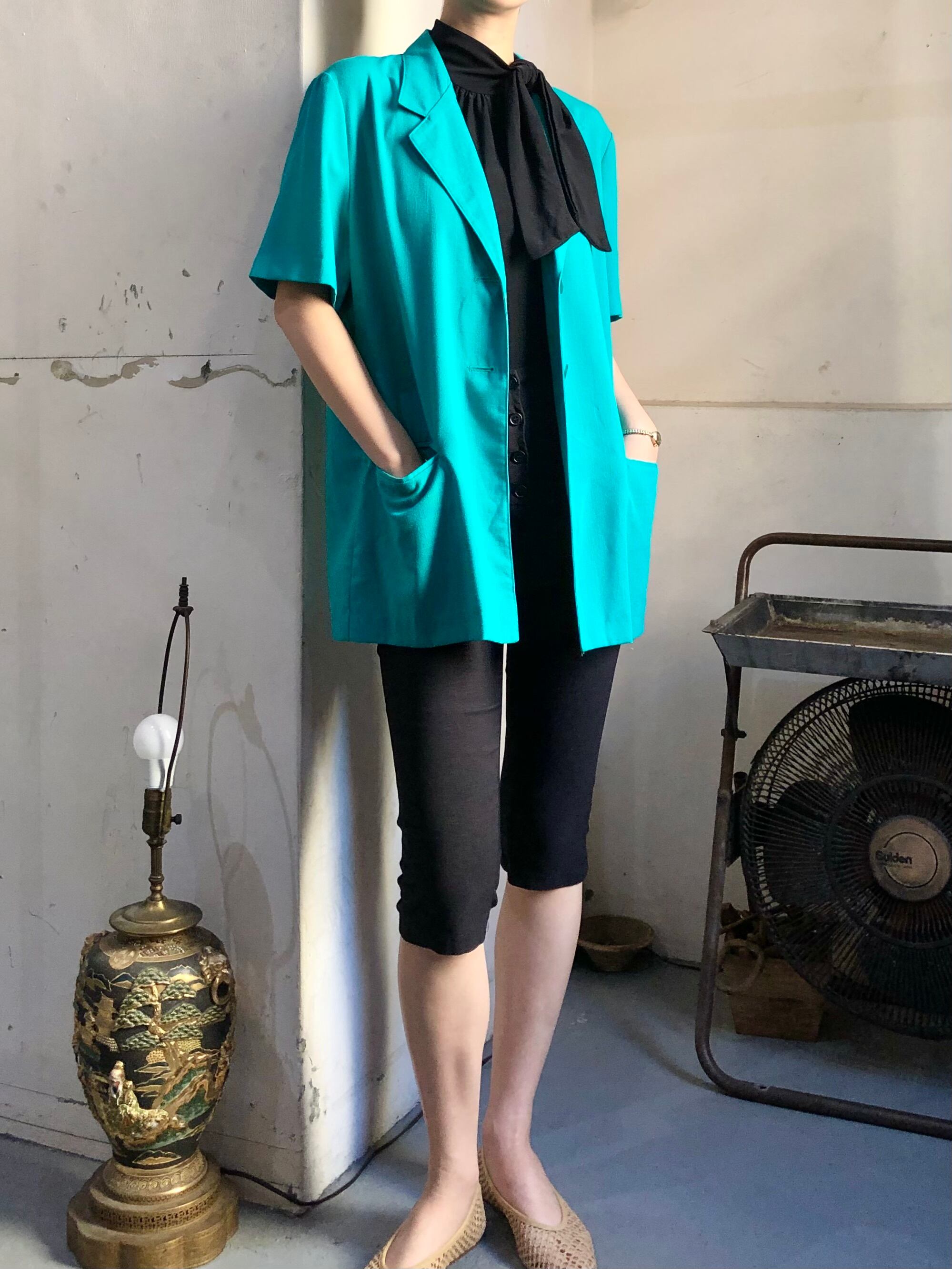 優しいグリーンカラーのテーラード半袖ジャケット。