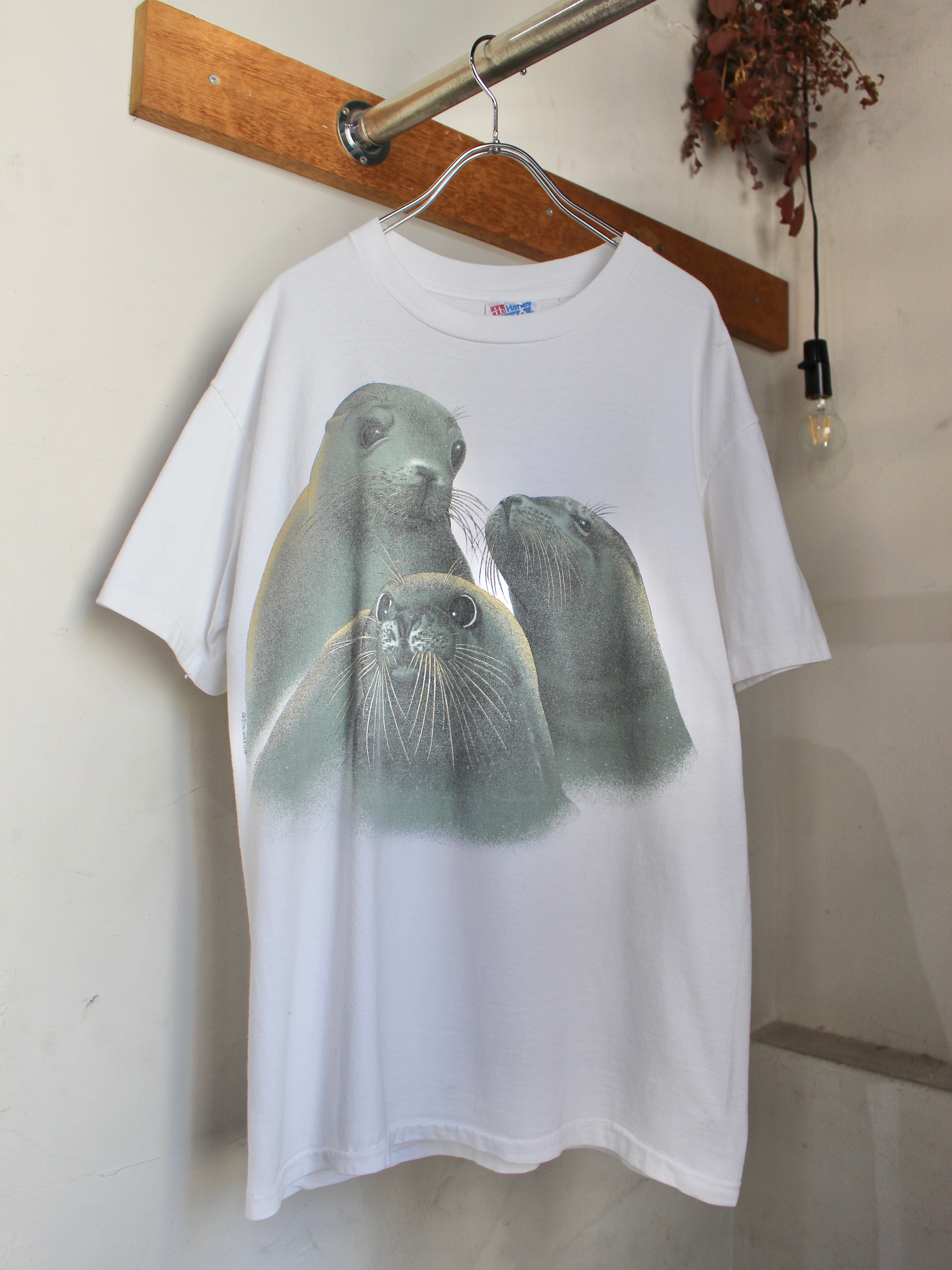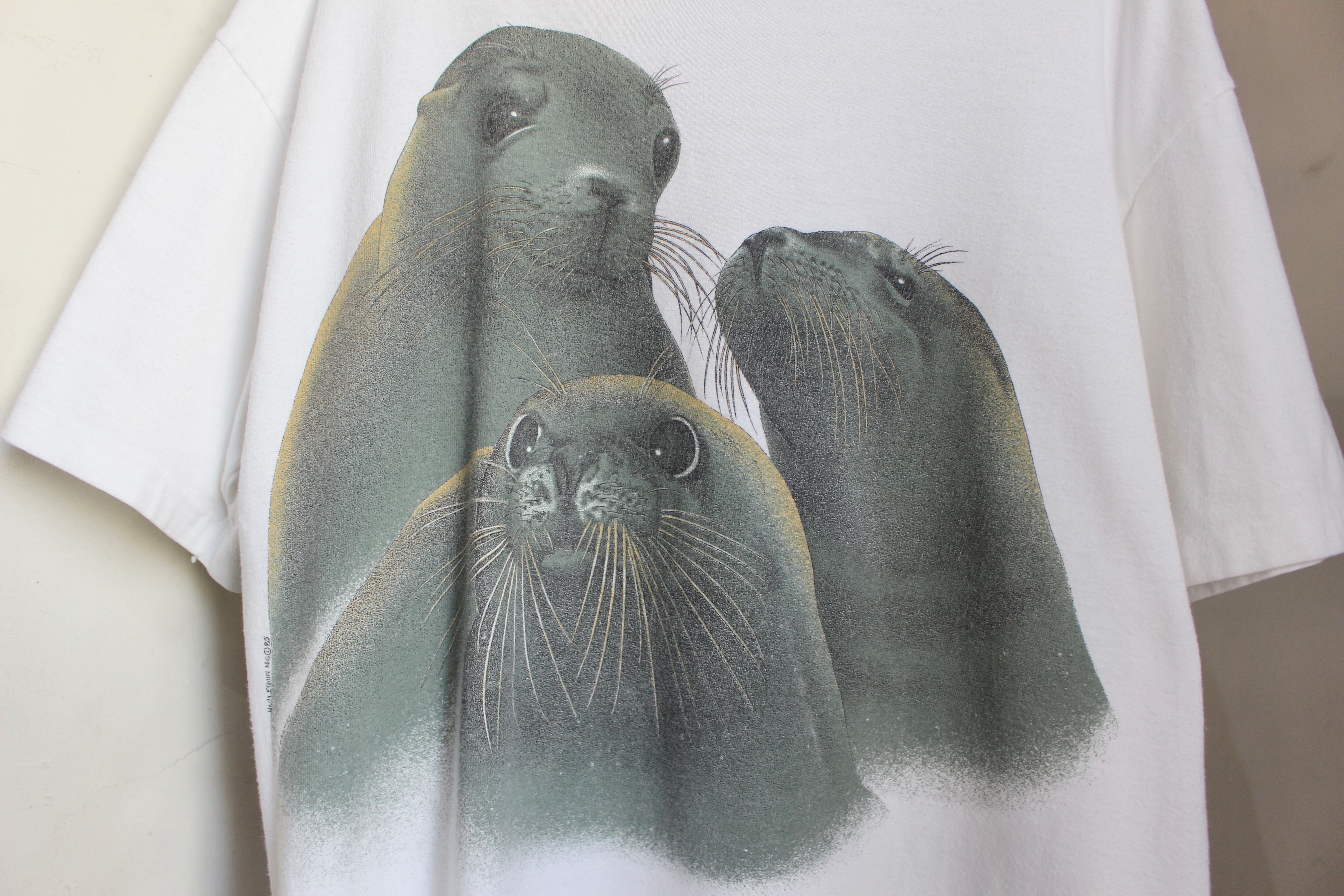 1980s "HARLEQUIN NG©︎85" seal print tee made in U.S.A / 古着 ヴィンテージ Tシャツ 白 ハーレクイン アザラシ USA製