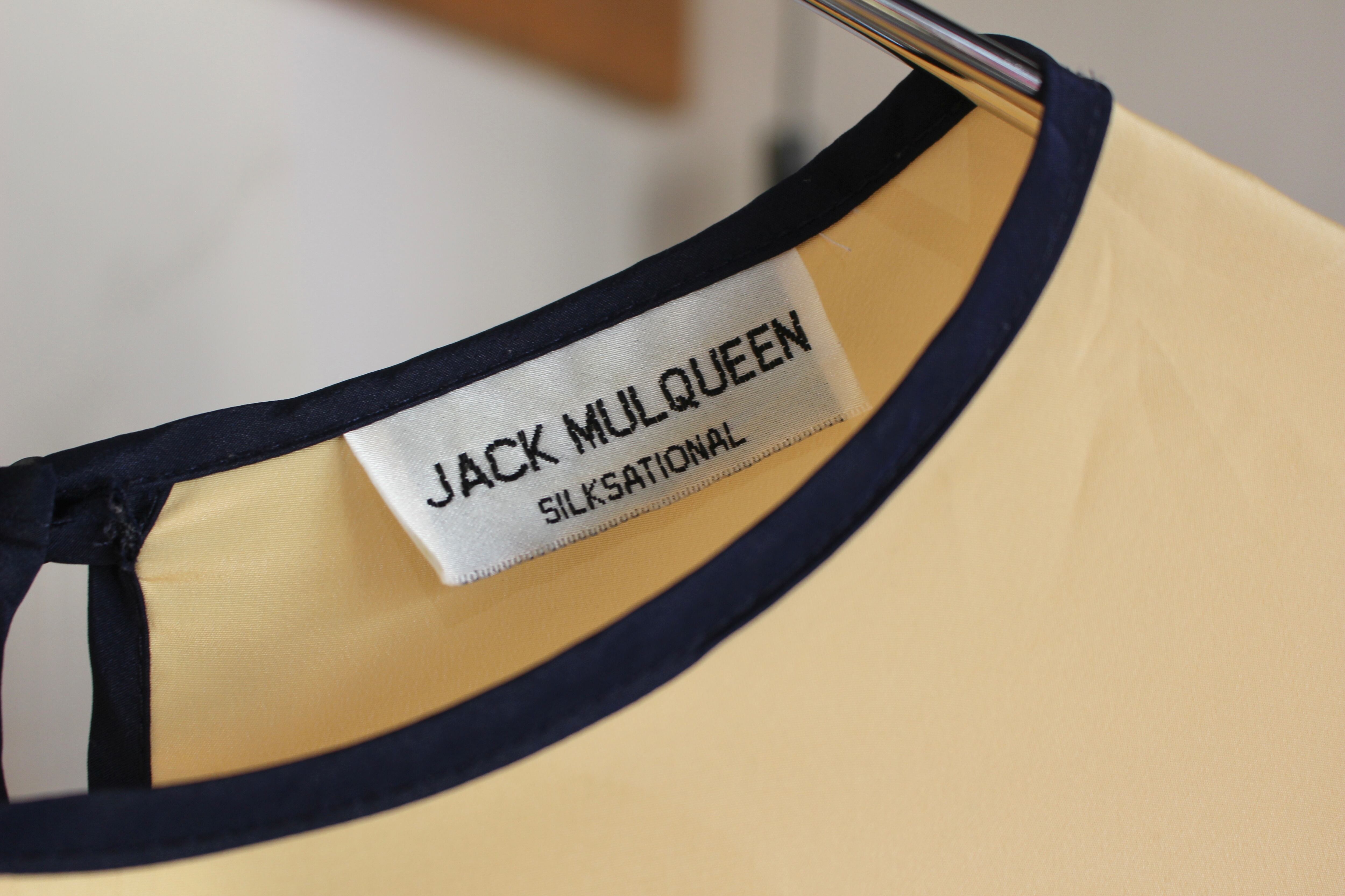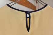 柔らかなイエローのボディに、首元がネイビーのパイピングになっています。