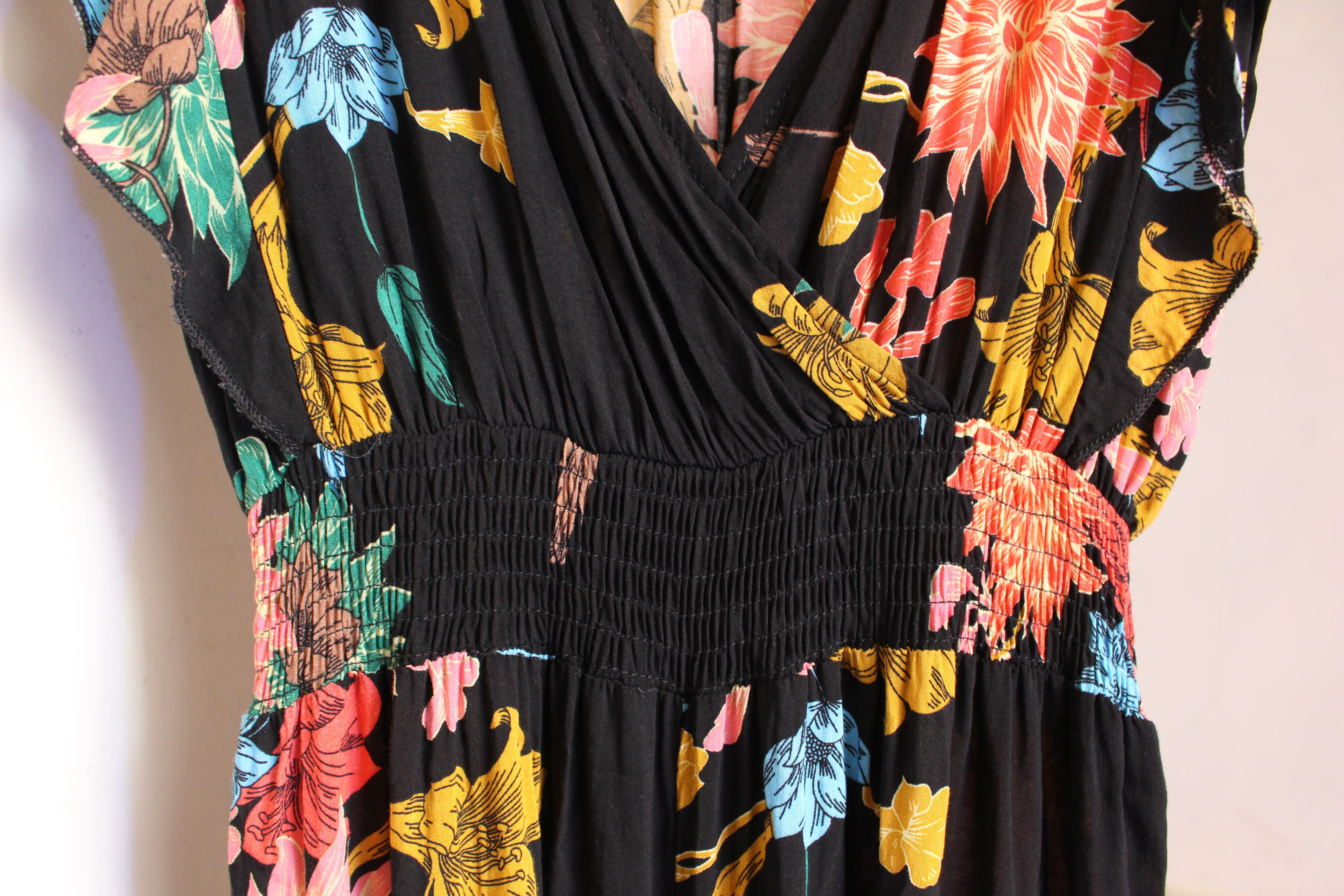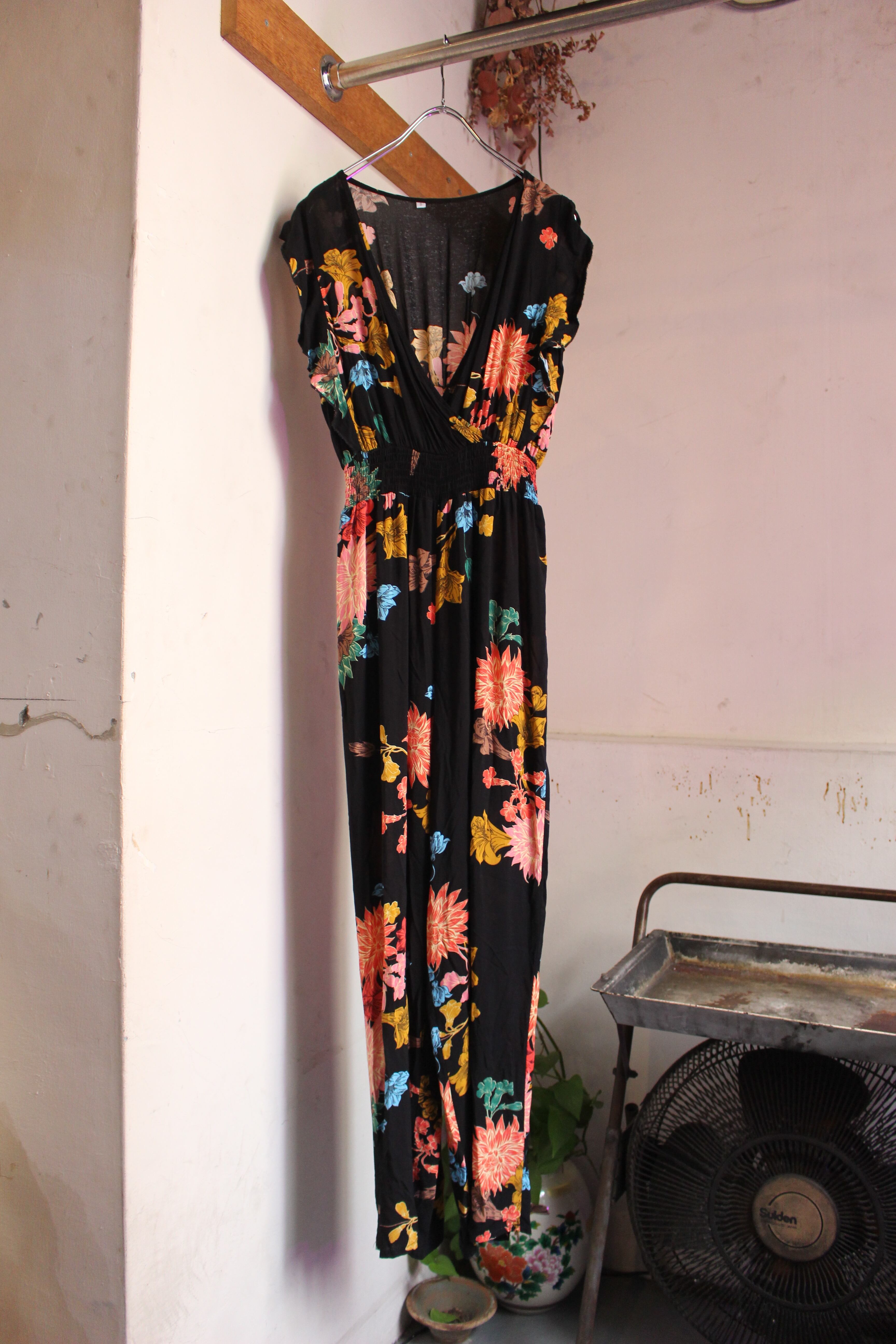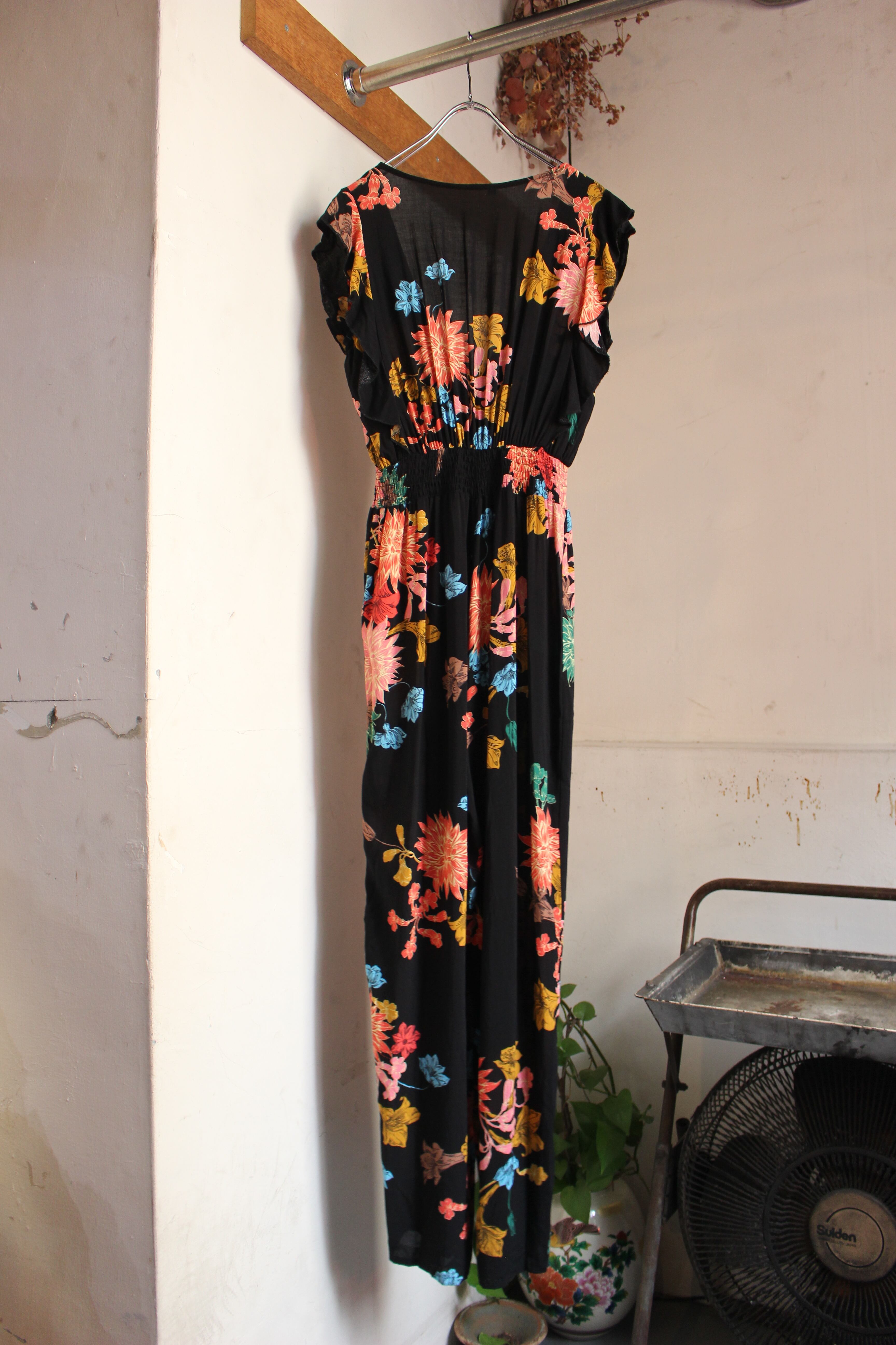 Colorful flower print black rayon jumpsuits / 古着 ヴィンテージ ジャンプスーツ オリエンタルデザイン 黒 花柄