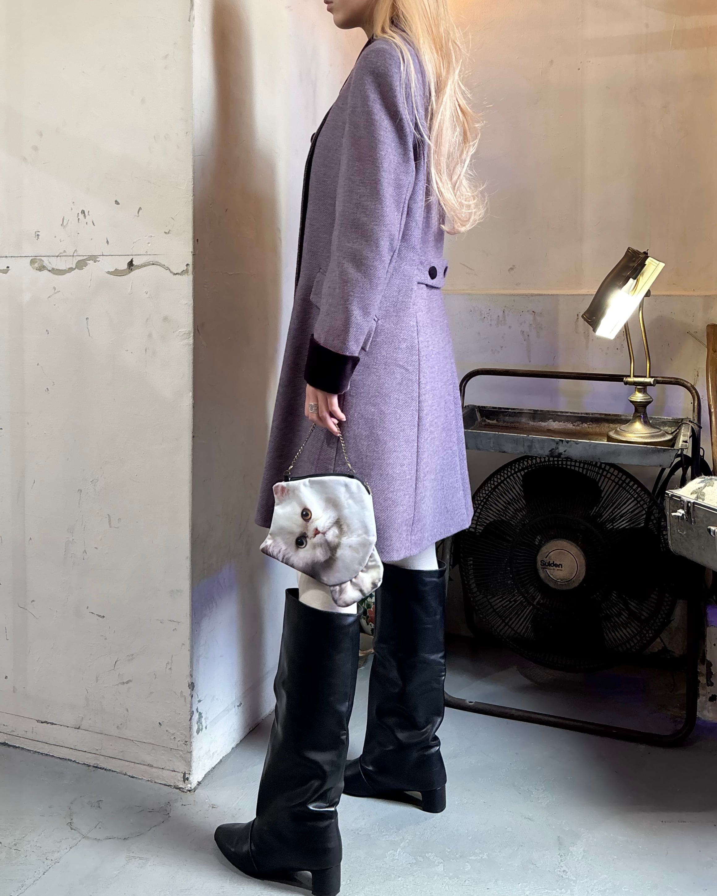 薄いラベンダーカラーのウール地に襟や袖元は艶やかな濃いパープルのベルベット生地の切り替えになっています。