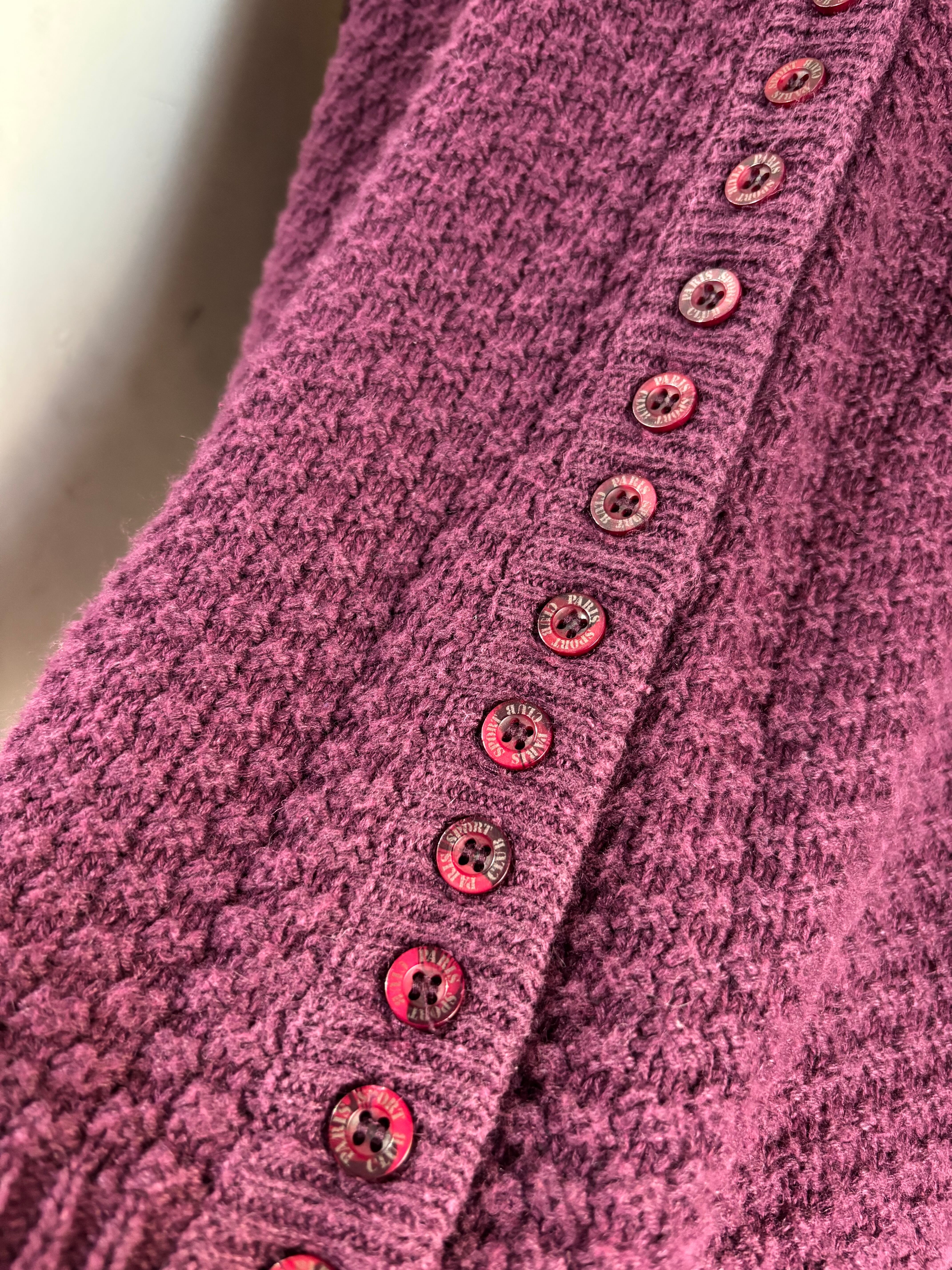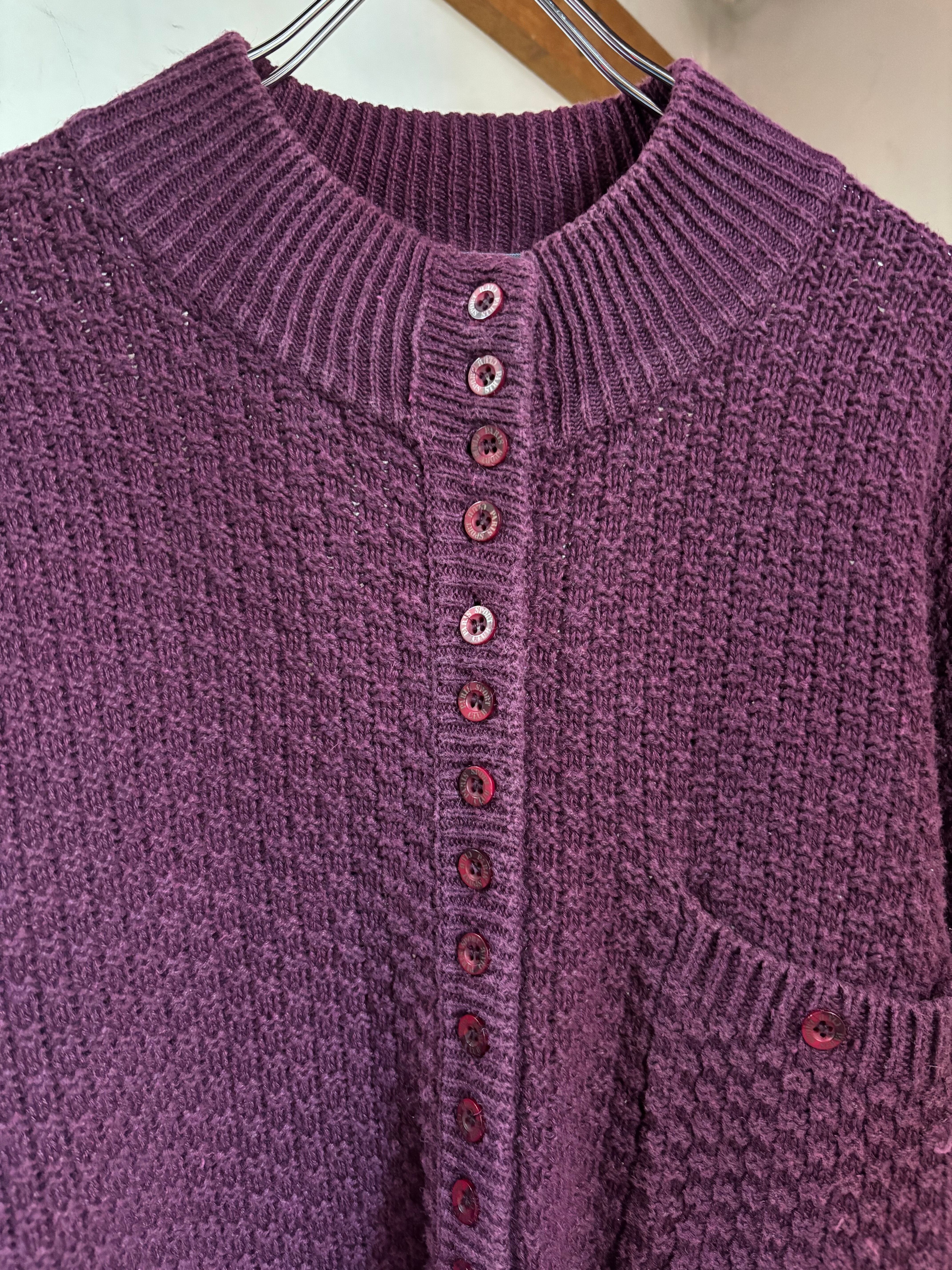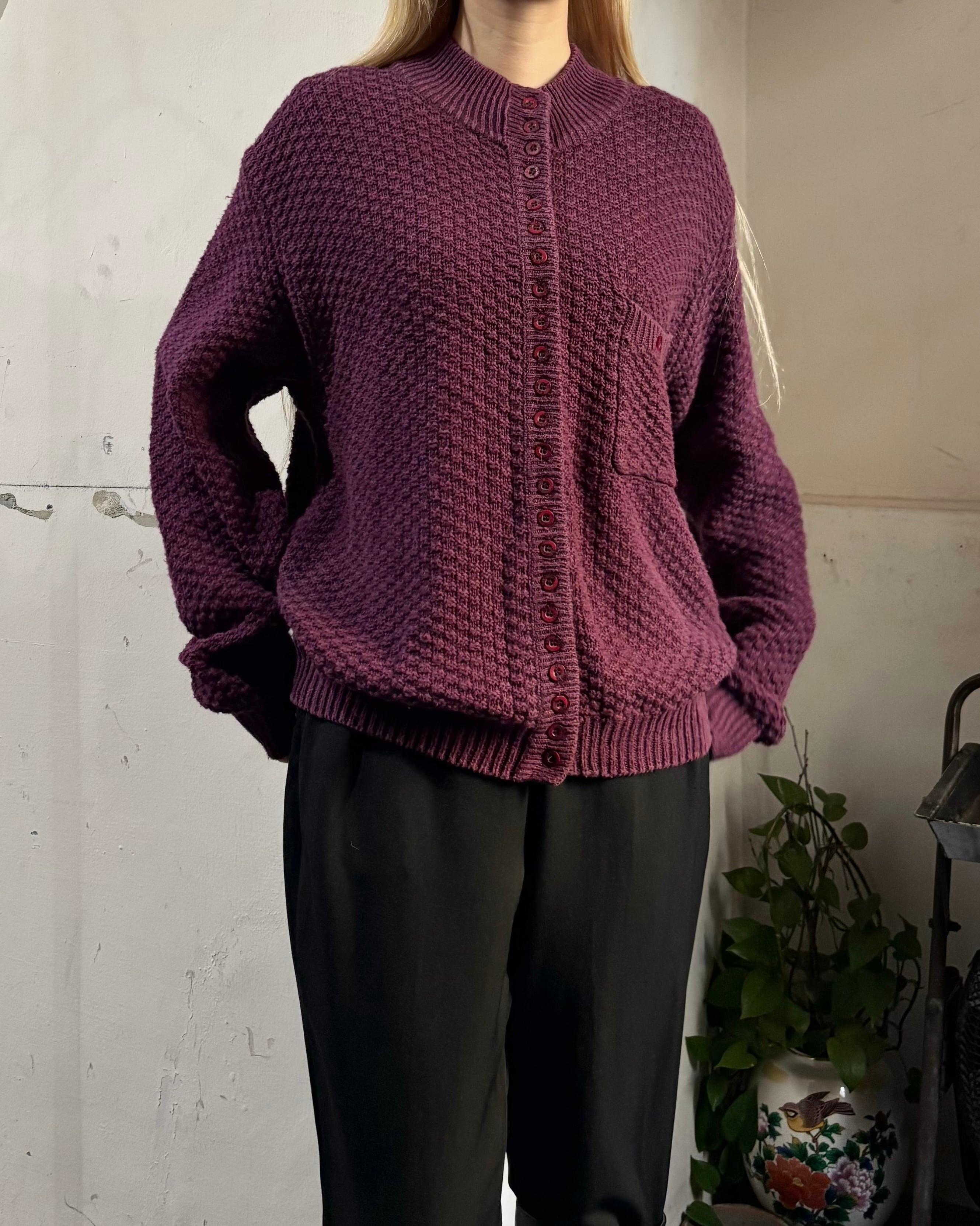 太く編まれたネックのリブや胸ポケット、葡萄色が可愛い一着。