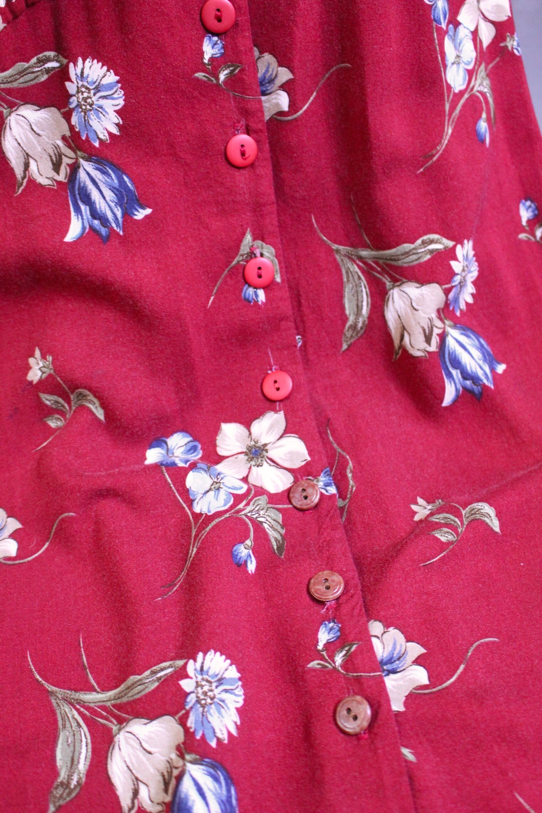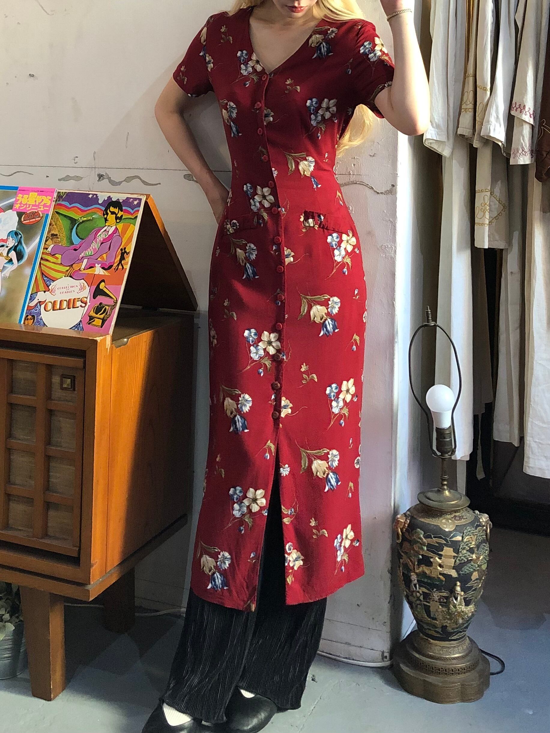 ボルドーのボディにブルーの花柄が映えるレーヨンドレス。
