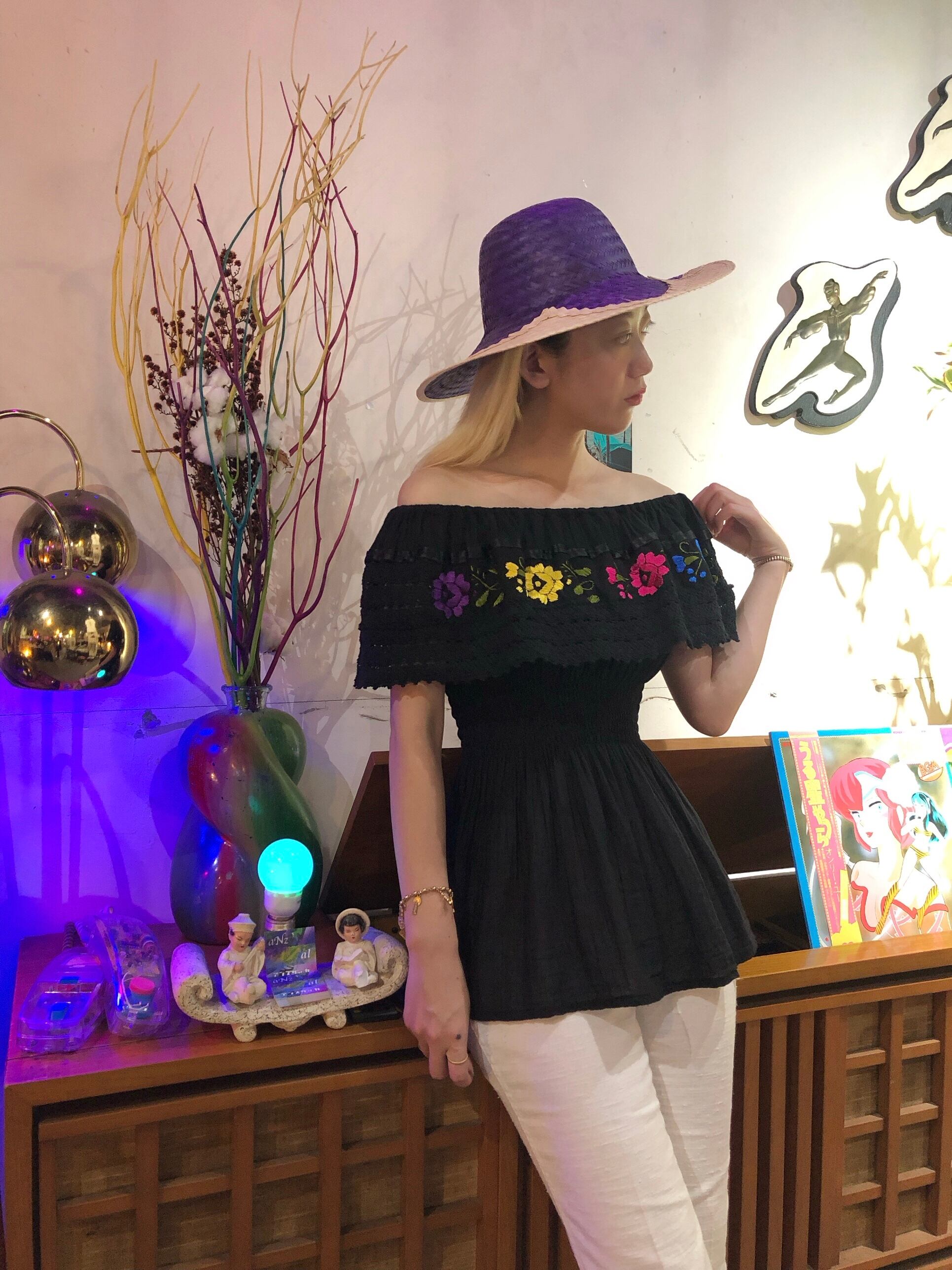 鮮やかなフラワー刺繍のメキシカンブラウス。