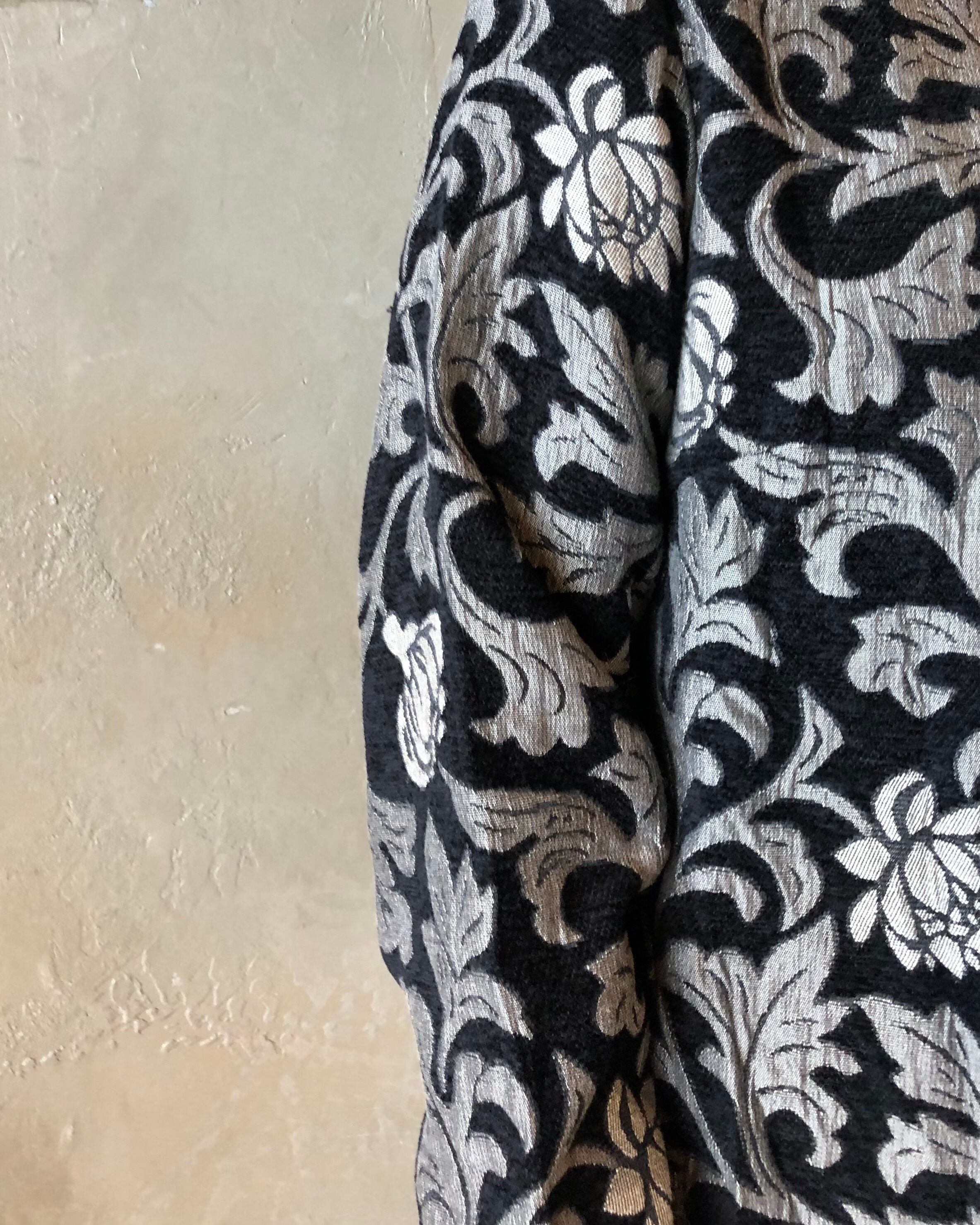 レーヨン混の少しとろみのある柔らかなボディはベロアに柄が乗っかったような生地。