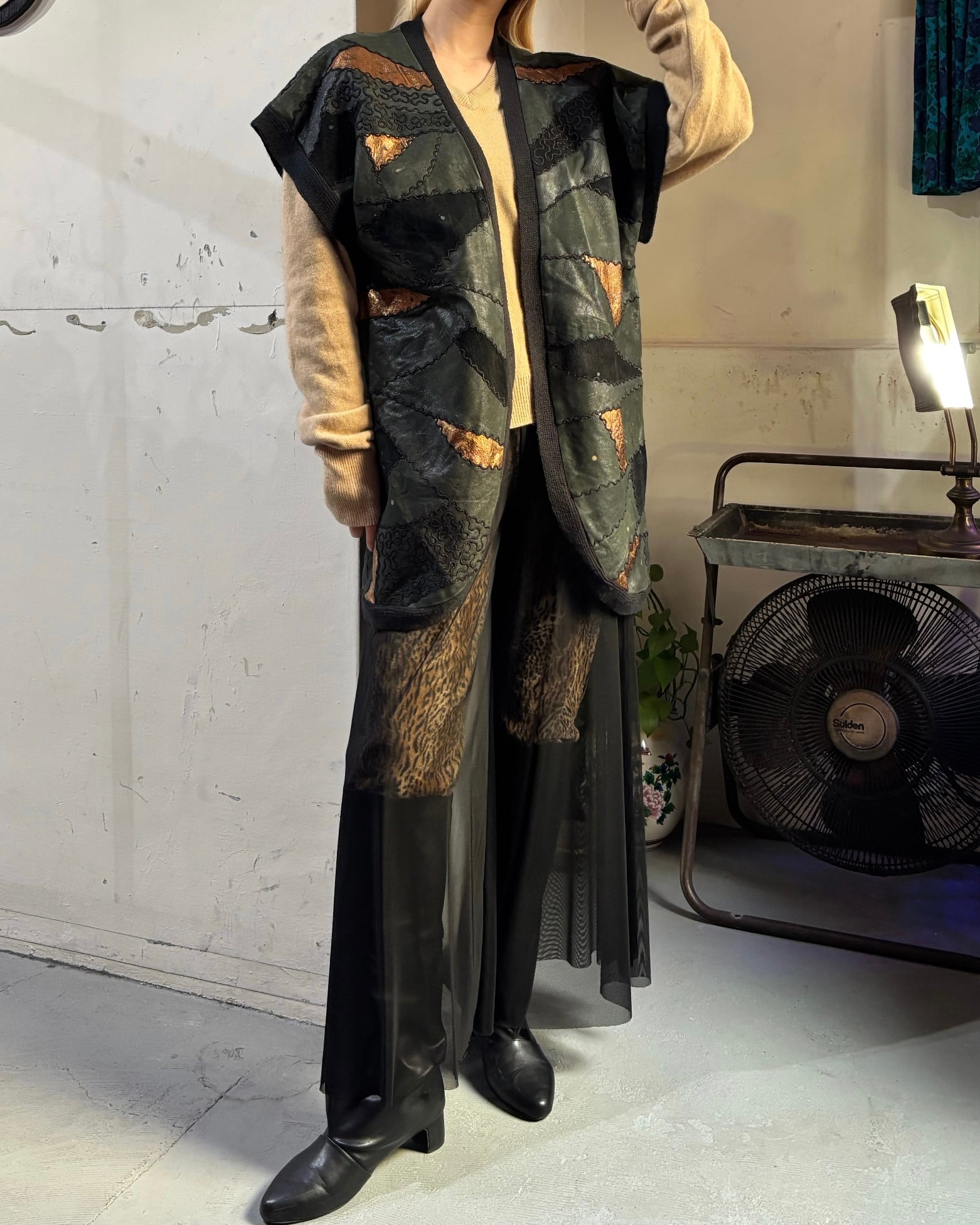 パッチワークが個性的なレザーベスト。